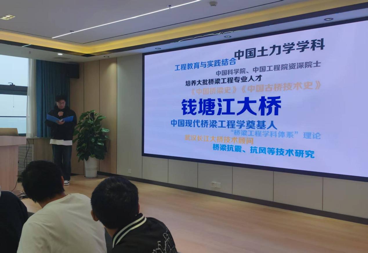 何子康同学带领全体师生回顾了茅以升先生的生平事迹。他生动讲述了茅以升先生“学桥、造桥、写桥”的不凡人生,尤其是主持设计钱塘江大桥时“炸桥复桥”的爱国壮举,展现了先生“国为重、桥为轻”的崇高精神。何子康还结合欲漫涩